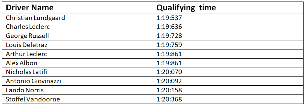 As mentioned, qualifying consisted of an 18-minute session (or about 15 laps) of the drivers going around the circuit, the fastest time deciding the grid for the race. Christian Lundgaard set the fastest pace, a blazing 1:19:537 minutes getting him to the head of the race grid, followed by Charles Leclerc in second place and George Russel in third.