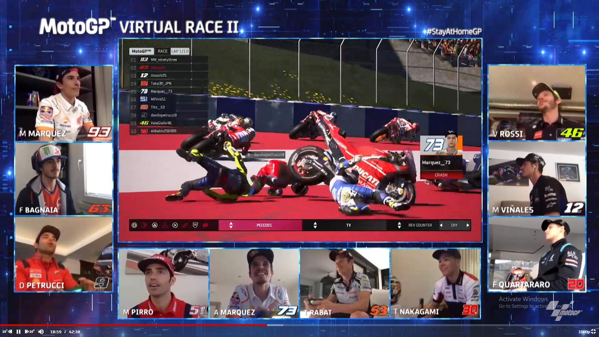 Big crash at lap one corner one during the #STAYATHOMEGPIn the midst of all this, Nakagami escaped and got onto pole, running wide into corner 2, giving the lead to Bagnaia and almost pushing Vinales into the grass. He later regained his lead, but then running wide and losing pace, lost out quite a few spots. By the end of lap 1, Francesco Bagnaia was leading, with Maverick Vinales in second place and Marc Marquez in third.