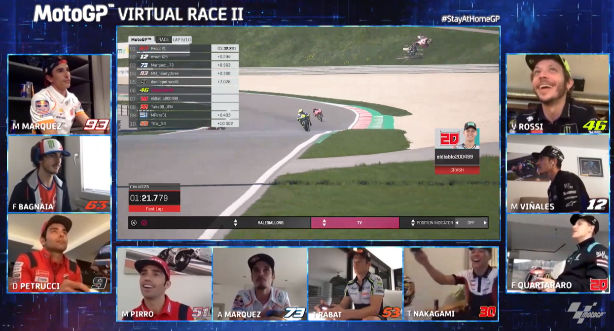 Nakagami-Quartarao crash during the second edition of the #STAYATHOMEGPAfter the chaos was all sorted, Vinales snatched the lead, his attempts at taking the inside line off Bagnaia finally paying off. The battle for third place, meanwhile, saw its share of sibling rivalry, before Marc ran wide and Alex, just 0.132 seconds behind him, shot ahead. Alex’ lead was further magnified when Marc again went into the gravel in the successive turn.