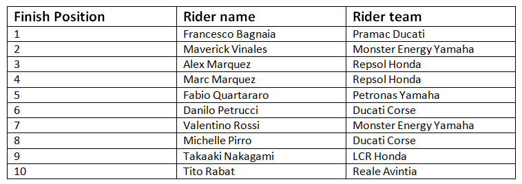 The final lap saw the status quo more or less preserved. Though Vinales did briefly pass Bagnaia in the downhill segment, Bagnaia hit back with a daring overtake that took him onto the grass, before going back on track with a burst of speed that immediately put him a few bike lengths ahead, that too in the last sector of the lap. Further down the line, Valentino Rossi, though out of scope for a podium finish, kept fighting till the end, his aggressive move to snatch fifth from Fabio Quartararo ending with a spill.