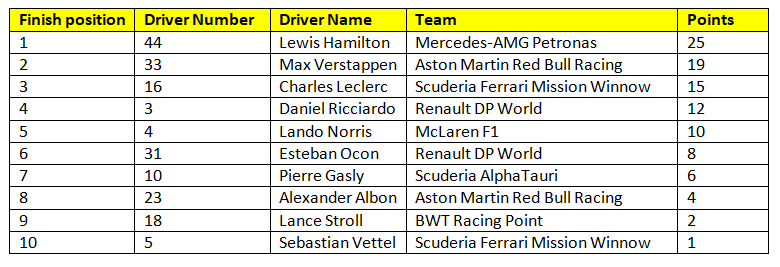 Aston Martin Red Bull Racing’s Alex Albon finished eighth, having recovered from a Lap 1 tussle with the Haas’ Kevin Magnussen that saw him fall to last, while BWT Racing Point’s Lance Stroll and Ferrari’s Sebastian Vettel rounded out the top 10, Vettel holding off a late charge from the recovering Mercedes of Bottas.