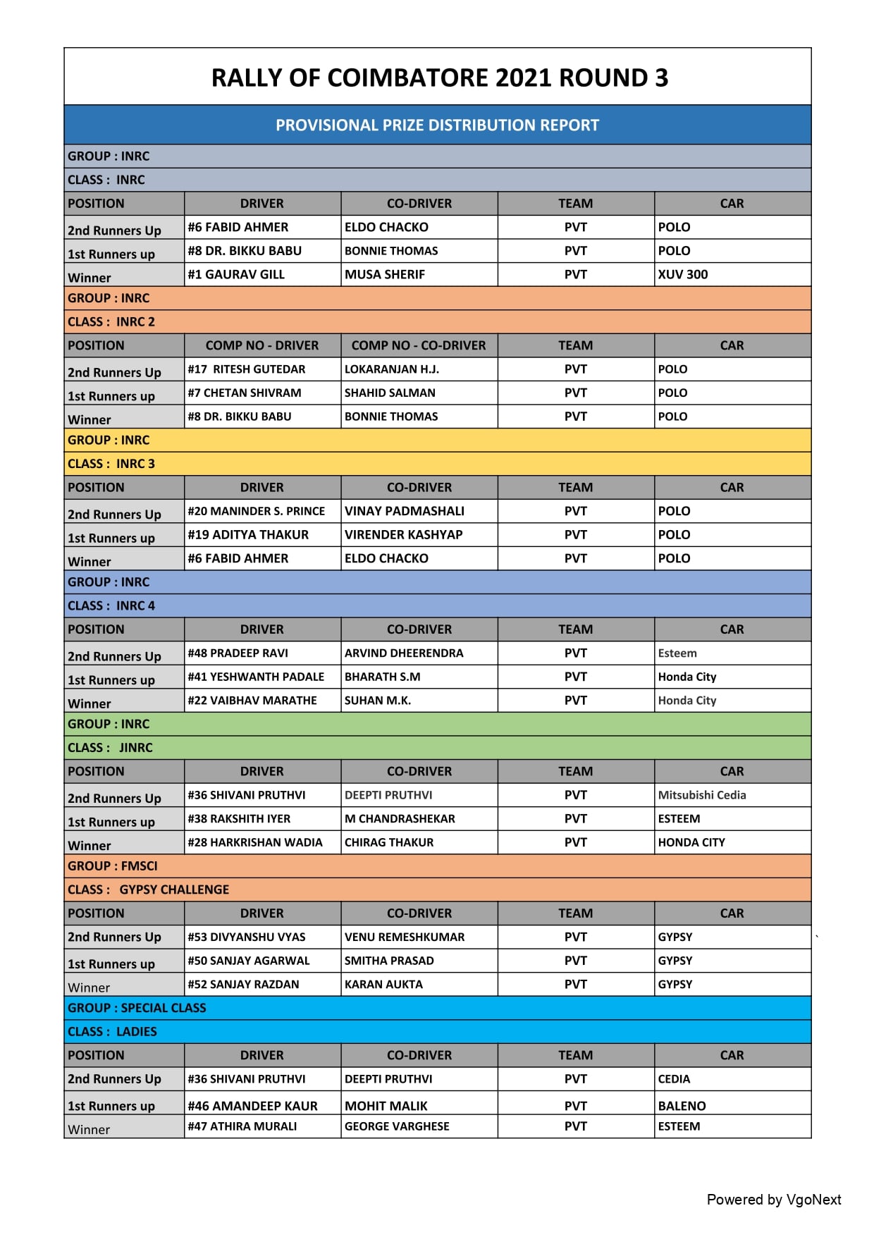 Team Nutulapati's Aditya Thakur (with Virender Kashyap) put in a time of 01:31:36.700 hours to finish behind Fabid in the INRC 3 category, while Maninder Singh Prince (with Vinay Padmashali) finished third with a total time of 01:32:57.400 hours.