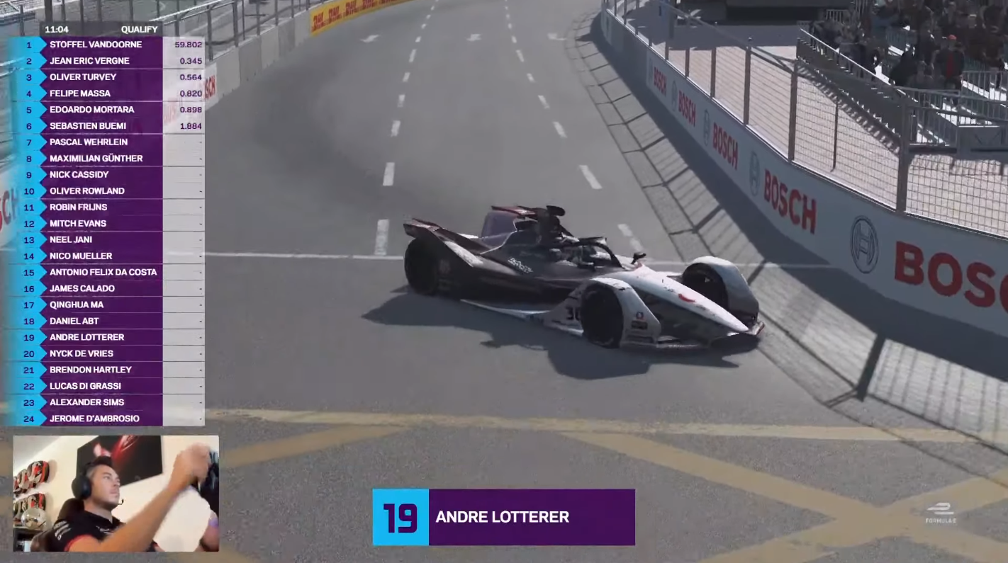 For the Driver grid qualifiers, Mercedes-Benz EQ’s Stoffel Vandoorne set the fastest time, winning the Julius Baer pole position. Now, while the actual Julius Baer Pole position winner gets a rolling trophy, in case of the Race At Home challenge, the pole position elicits an additional €1000 donation by Julius Baer bank, to UNICEF. The racer qualifying second was Mahindra Racing’s Pascal Wehrlein, followed by BMW iAndretti Motorsport’s Maximilian Gunther. The top three racers were a class of their own, finishing within two-tenths of a second of each other. Meanwhile, DS Techeetah’s Antonio Felix Da Costa crashed into the wall after Corner 3 and spun out, causing him to qualify last, 7 seconds behind Nissan E.Dams’ Sebastien Buemi.