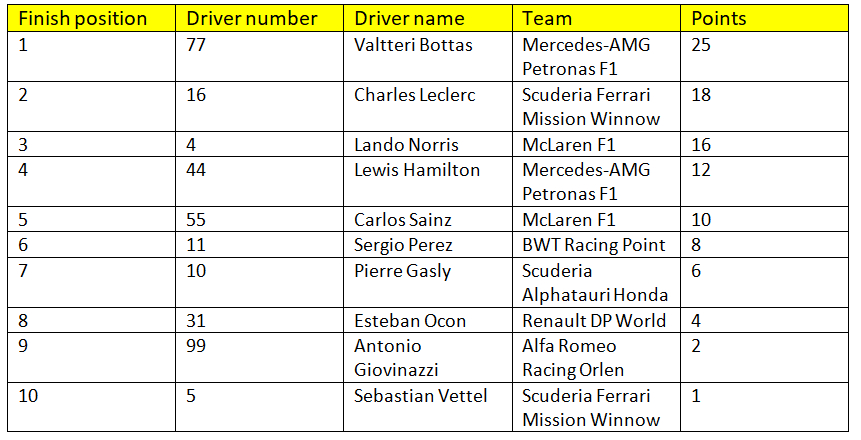 A late surge for Leclerc after a difficult weekend for Ferrari saw him climb to third by the flag, meaning he inherited second after the Hamilton penalty, while a late pass on the BWT Racing Point of Sergio Perez was enough to give Norris the P3 spot, which also saw McLaren begin a season with a podium for the first time since 2014.