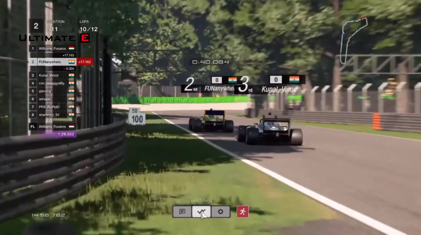 Chaos reigned in Lap 1, Corner 1 at MonzaSoon, Shameem was fending off advances from Aditya Bakshi who was 2.225 seconds behind. Meanwhile Patrik in had already managed to climd to P4, and was 3.7 seconds from the leader. By third lap Patrik was in P2. Shameem was still in the lead, about 3 seconds ahead, while Ravikiran had gone up only one position. By the end of the lap, Bakshi was in third, while his Chennai teammate Dillion Zacharia was in fourth.