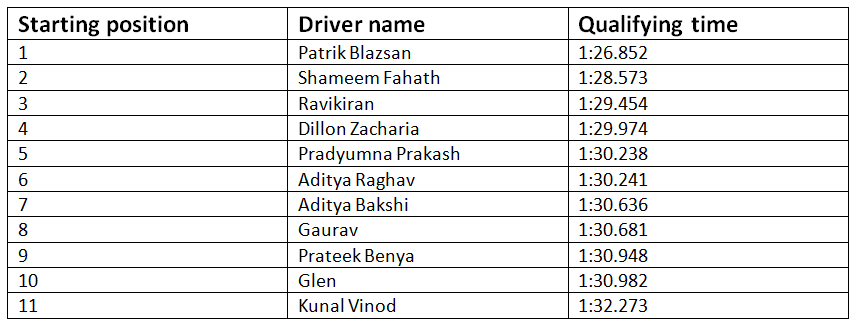 Considering his professional experience, it was no wonder Patrik Blazsan set the fastest qualifying time, almost two seconds quicker than Shameem Fahath, with Ravikiran and Dillon Zacharia making up the second row of the starting grid. The timings for the qualifying lap were as under: