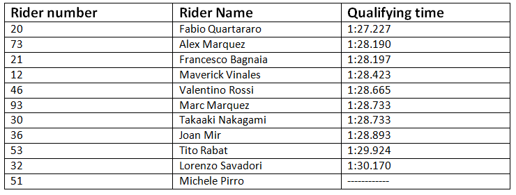 Petronas Yamaha’s Fabio Quartararo set the fastest time for the third time so far this season, with Repsol Honda’s Alex Marquez less than a second behind him. The results of the qualifying were as under: