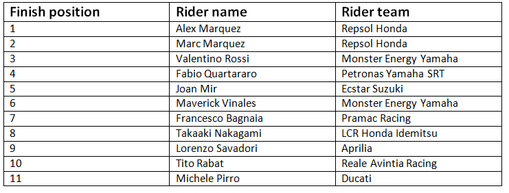 Alex Marquez snatches the lead from brother (and teammate) Marc in the final corner of the raceUltimately, it was Alex Marquez who took the win, his second victory so far in the Virtual Moto GP season, with brother Marc taking P2 and Valentino Rossi taking P3, the Italian racer’s first virtual podium, aptly at his home grand prix.