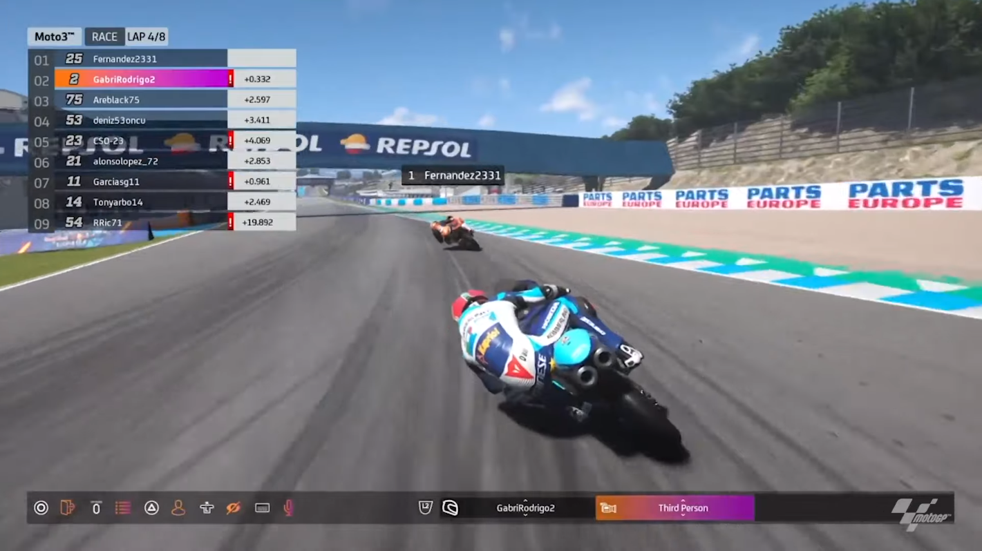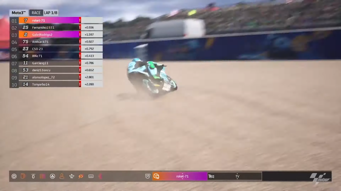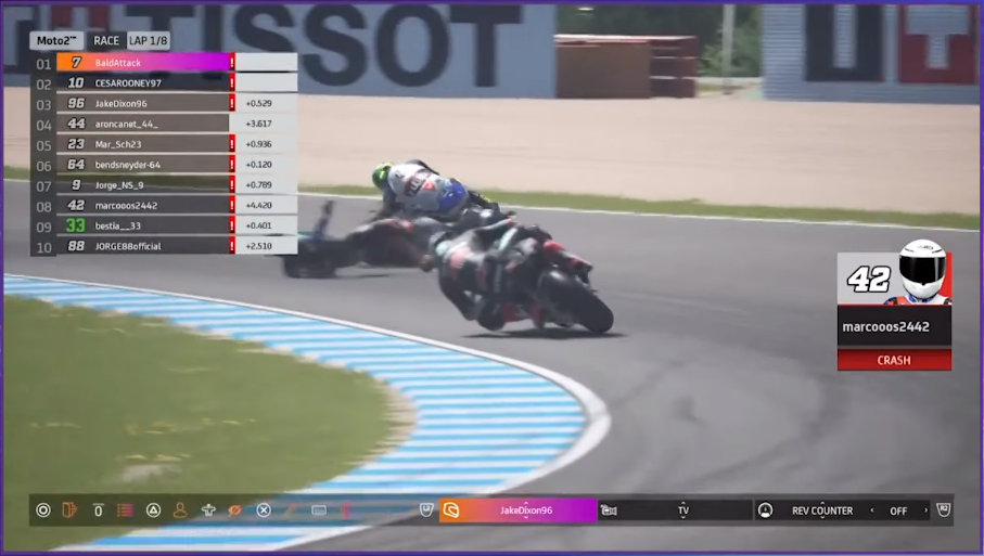 Dennis Foggia crashLap two saw Fernandez regaining the top spot, with Gabriel Rodrigo climbing past the competition into second place. Meanwhile, Dennis Foggia disconnection (due to internet problems) reduced the grid to nine racers, with Ricardo Rossi now dead last.