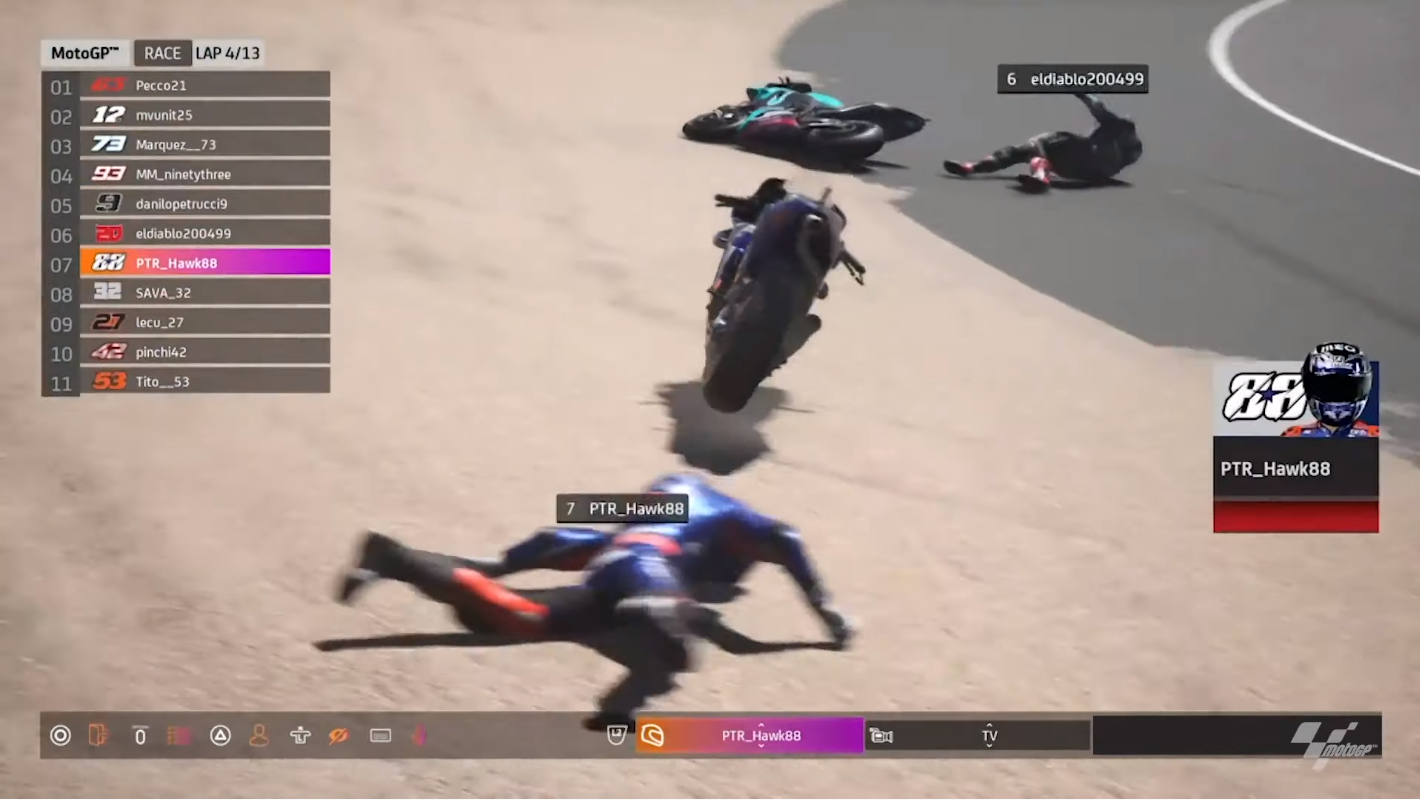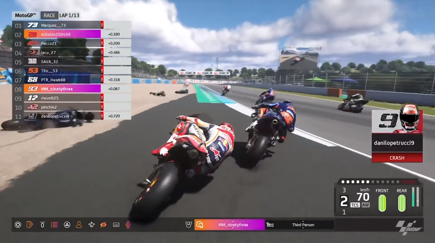 Lorenzo Savadori crashesUp ahead, Bagnaia was calm and completely in control, now close to 4 seconds ahead of Alex Marquez. Vinales, however, was scrabbling to stay in third place, fending off attacks from the elder Marquez, who was able to momentarily cinch third place. At the back of the pack, Savadori was doing his best, albeit unsuccessfully, to get past Lecuona. Regardless to say, the lack of experience with the console and the game, was apparent.