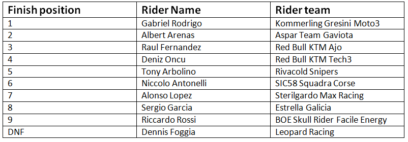 The final lap of the race was easy goings for Rodrigo, with a lead of over 4 seconds on Arenas, and a further seconds over Fernandez. The Argentinian finally took the victory, his first Moto3 win, both virtual and outright, with Arenas coming in second and Fernandez coming in third.