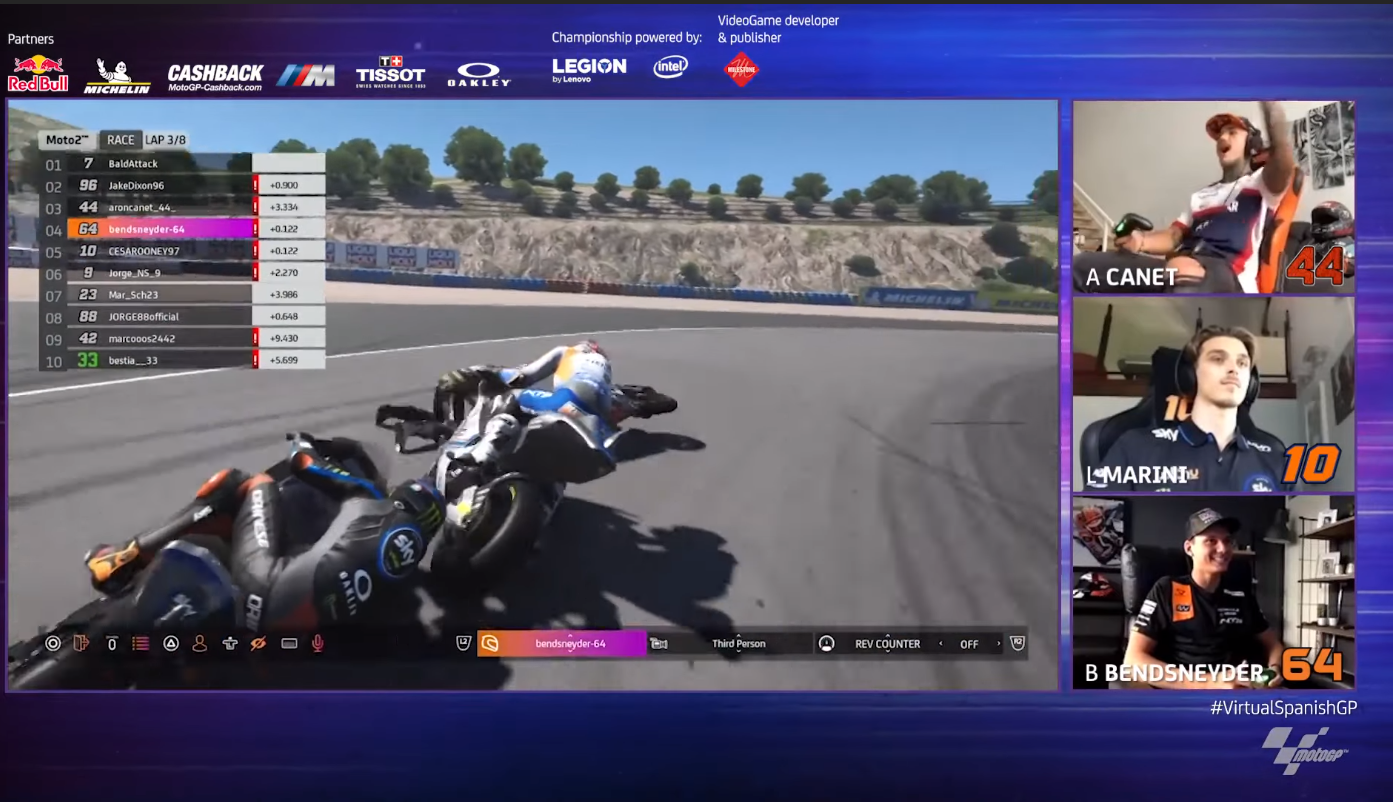 Fabio Quartararo set the fastest time in qualifying, the second time he’s taken a virtual pole position. He was followed by Alex Marquez and Francesco Bagnaia, all three finishing within half-a-second of each other. Also, this time around the roster had 11 racers, with Iker Lecuona making his comeback and former European Superstock Champion and 125, WorldSBK and FIM Enel MotoE World Cup rider Lorenzo Savadori making his virtual racing debut.