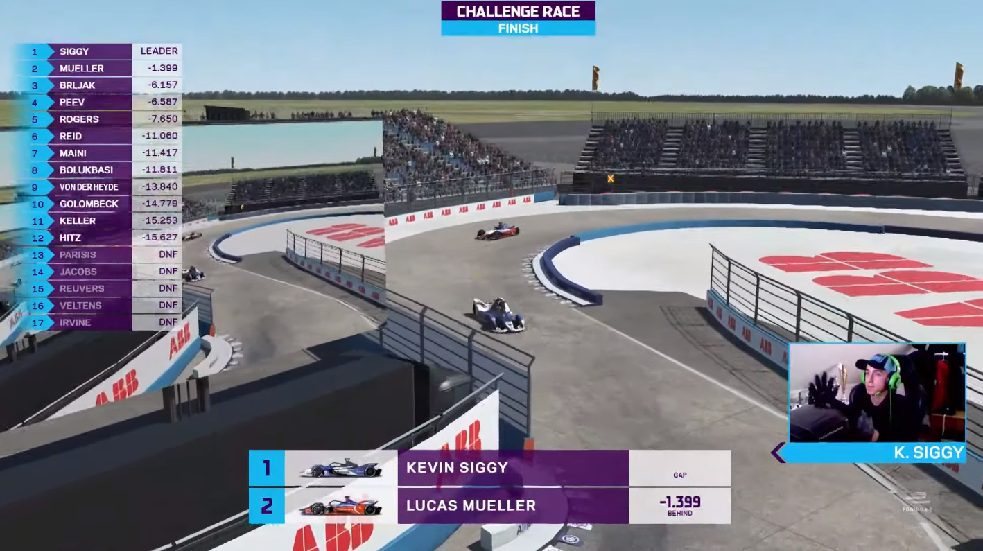 Kevin Siggy wins the Challenge grid race, and with it the championshipSo there it was: BMW iAndretti’s Kevin Siggy was now the champion of the Formula E Race At Home Challenge grid, followed by Mahindra Racing’s Luca Mueller and Panasonic Jaguar Racing’s Petar Brljak.