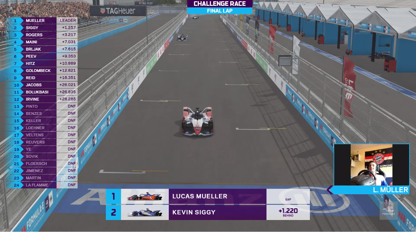 Mahindra Racing's Lucas Mueller wins the Challenge grid race at round 7 of the FIA ABB Formula E Stay At Home challengeMueller’s victory puts him at P2 for the final race of the FIA ABB Formula E Race At Home challenge, with Siggy still holding on to the championship lead.