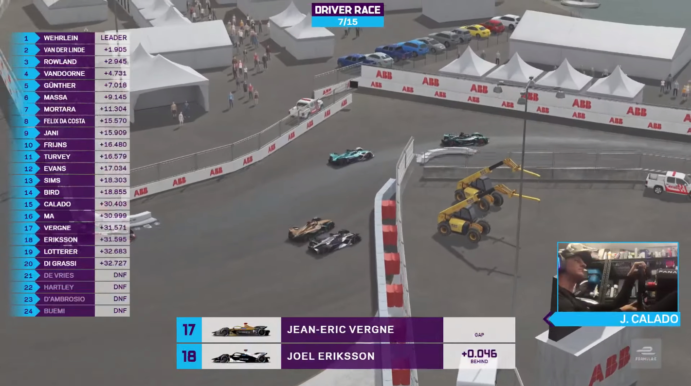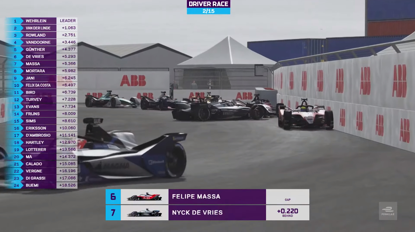 By lap 4, the leaders had spread out, with about 1.5 seconds separating the first five racers. Meanwhile, Rokit Venturi’s Felipe Massa was in P6, his best showing so far in the championship. Another lap in, and Wehrlein was over 2 seconds ahead of Van Der Linde. Almost at the back of the grid, DS Techeetah’s Jean Eric Vergne (P18) pulled a really risky overtake on Geox Dragon’s Joel Eriksson, going up a spot in Corner 1 of Lap 7.