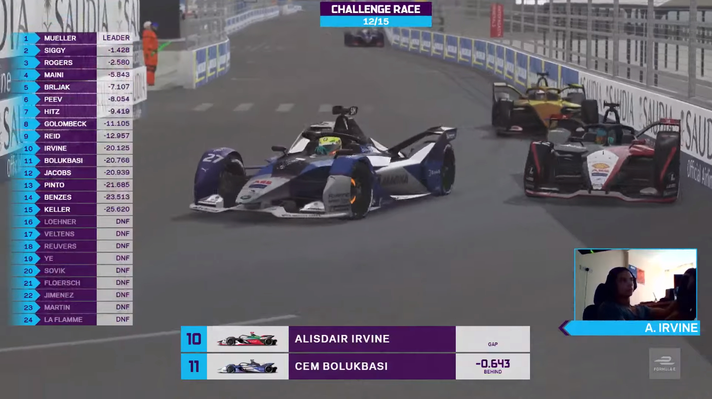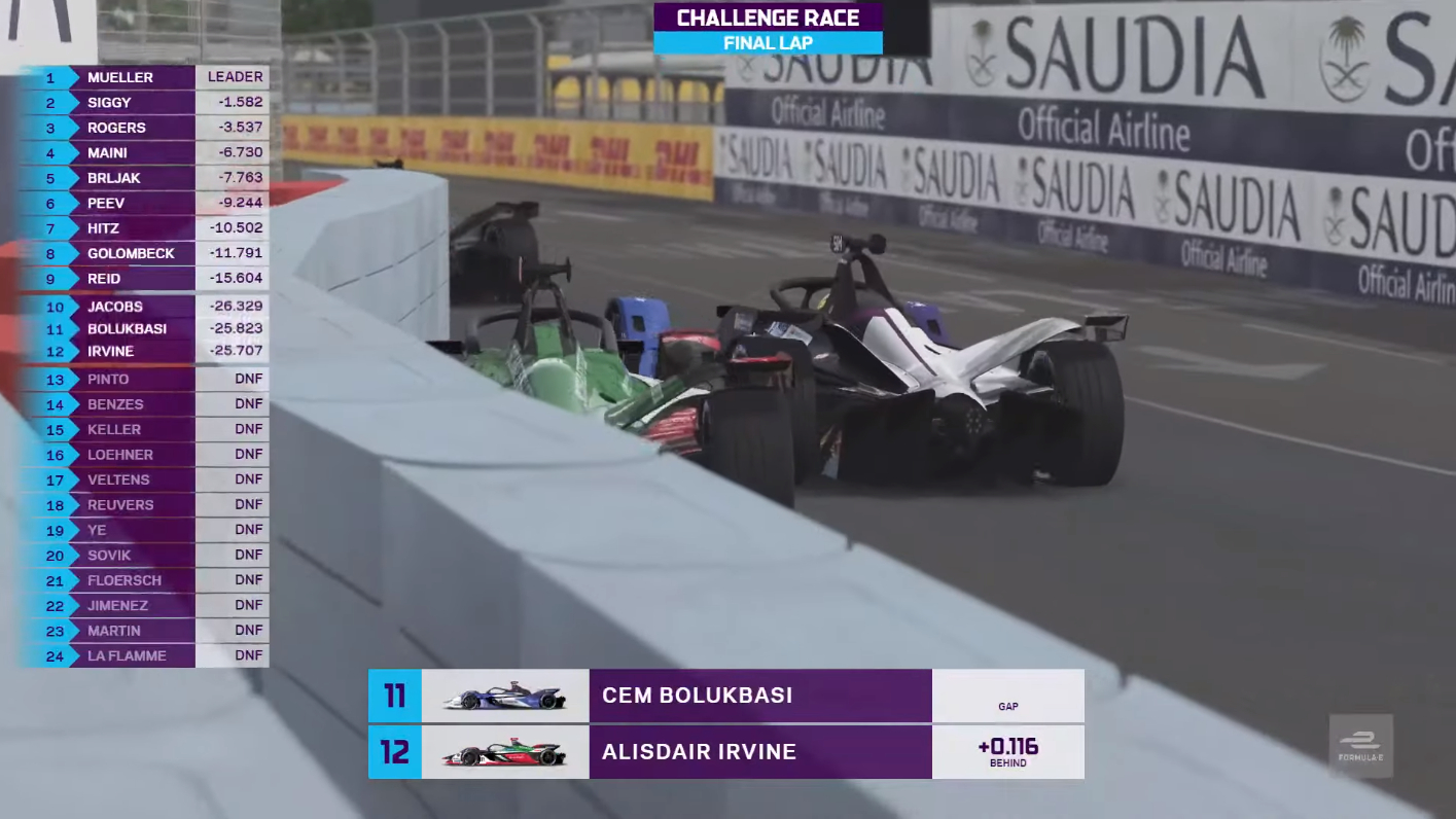 With four laps to go, the positions throughout the race were still basically unchanged. The top three were still Mueller, Siggy and Rogers, with Maini in P4 and Irvine in P10. In P11, however, Bolukbasi finally saw an opening and leapt, bagging P11 from Jacobs in Corner 10.