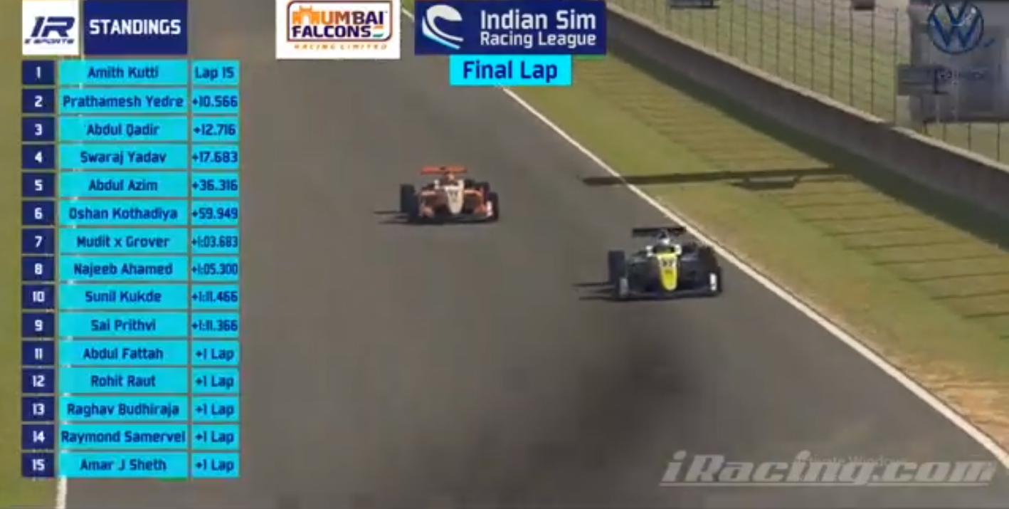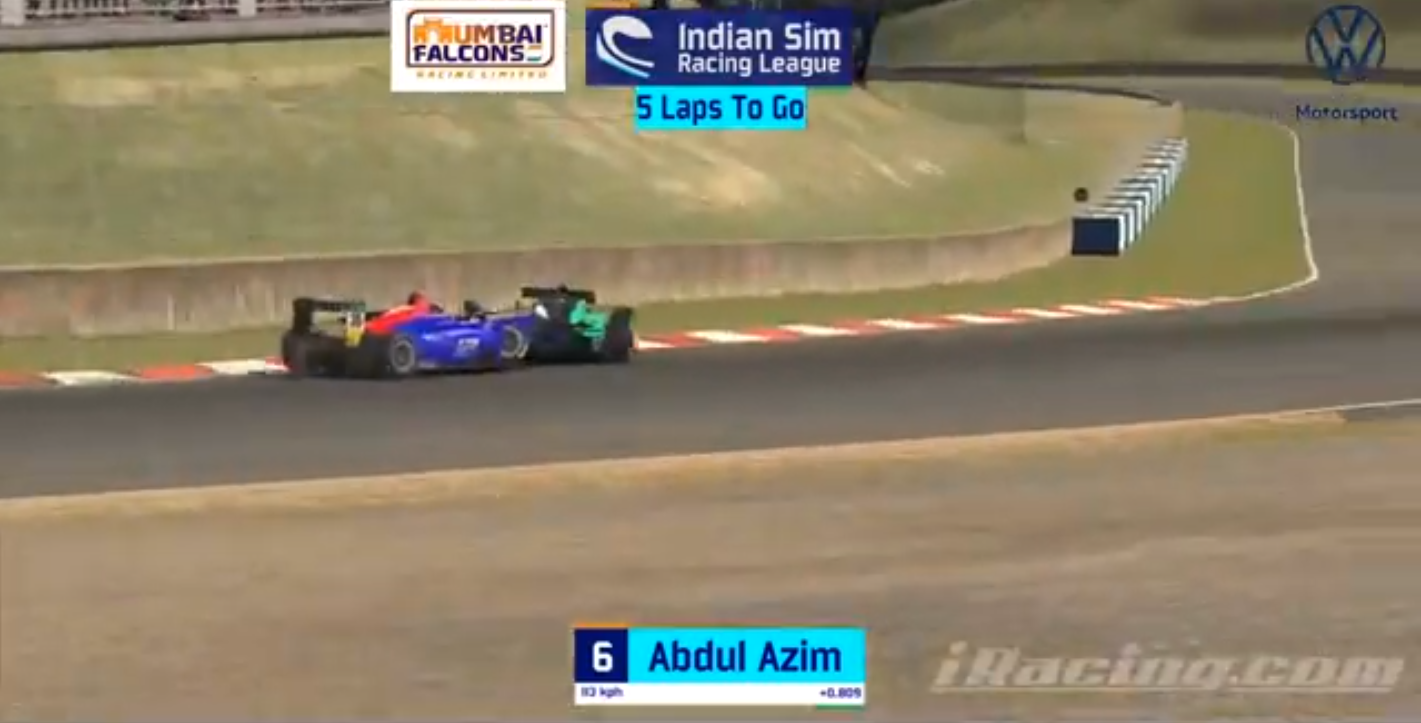 As the air cleared and the racers had covered some ground, the battle for third emerged between Justin Singh and Abdul Azim, before Azim lost control in final sector of lap 1. By the end of Lap 1, everybody except top 11 had to use ‘tow trucks’, or depend on the ‘quick repair’ option, that instantaneously negates damage for up to 15 minutes, enough time to maintain your position in the race and get to the pits to rectify any critical issue. This is done as this version of the iRacing platform, with the most recent damage model physics, designs the racecars to take a fair amount of damage, so crashes can break off parts, sometimes completely writing off the cars.