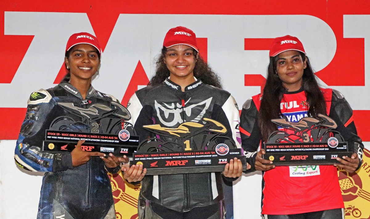 Round 3 of the MMSC MRF FMSCI Indian National Racing Championship 2024 concluded with TVS Racing boys leading the championship tally by a fair margin. Both Sarthak Chavan and Chiranth Vishwanath proved again why they are some of the best upcoming racers in India, with wins in the Pro-stock 165cc Open and Pro-stock 301-400cc Open classes respectively. Abdul Basim too grabbed another win continuing his undefeated streak into the next round in the Novice (Stock 165cc) class.