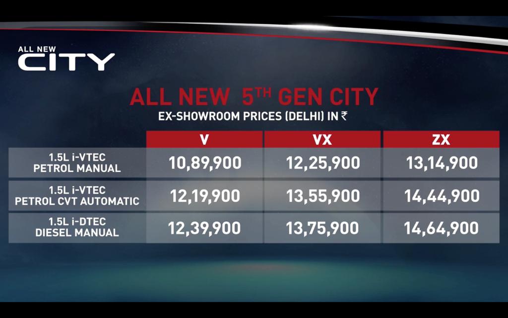 Variant wise features of the new Honda CityOn the powertrain front, Honda has carried over the 1.5-litre i-VTEC petrol engine from the fourth generation City. It now gets a new head featuring twin overhead cams. The engine makes 119.3bhp (2bhp more than before) and 145Nm of torque. This engine can be had with a 6-speed manual transmission or a CVT. The latter delivers a claimed mileage of 18.4kmpl while the manual delivers 17.8kmpl. That said, the 1.5-litre i-DTEC diesel engine puts out 99bhp and 200Nm of torque and can be had only with a 6-speed manual gearbox.