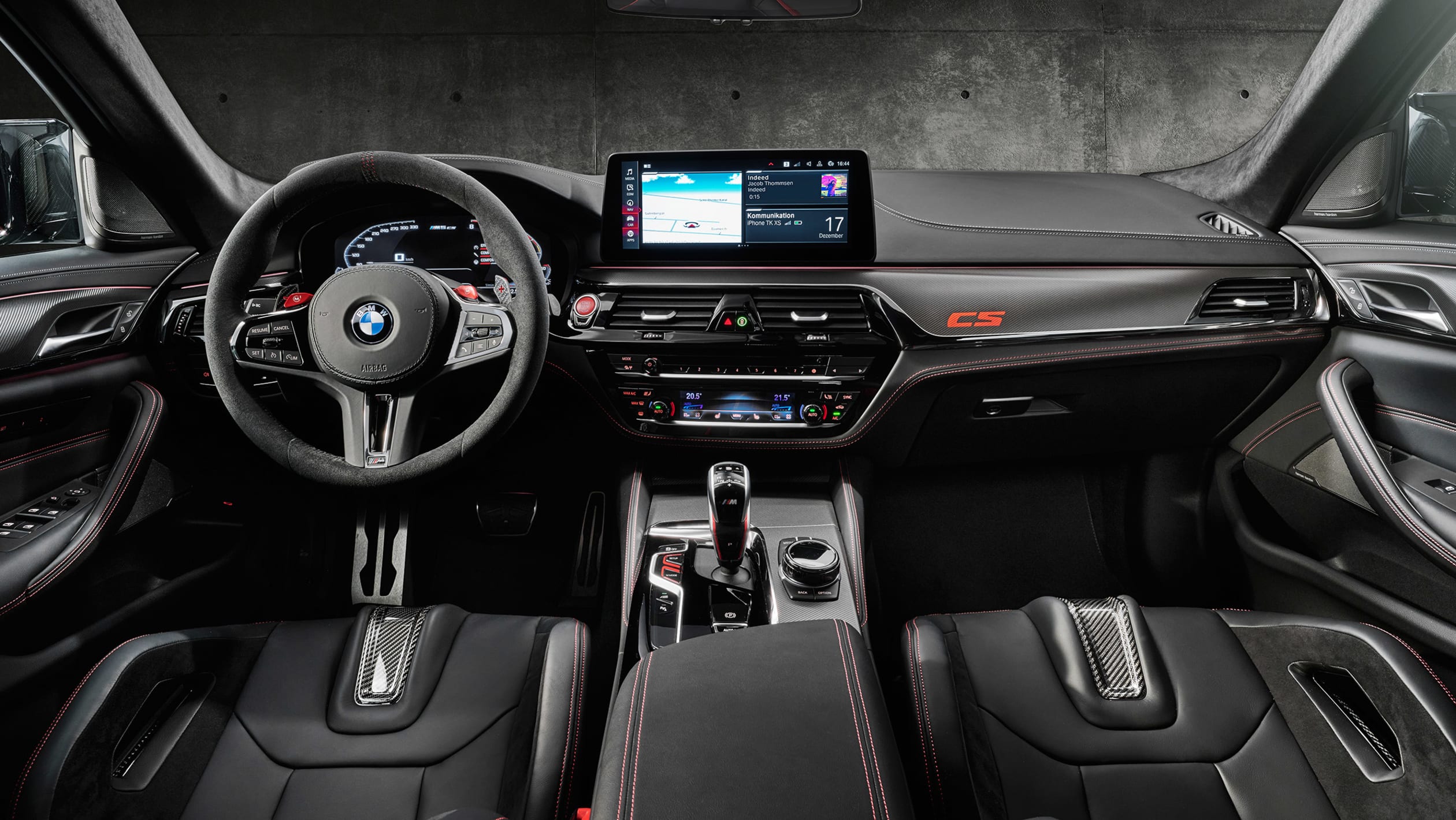 M5 CS gets Alcantra finish on the steering, dash and roof liningAlso part of the M5 CS package are a set of carbon-ceramic brakes, gripped by six-piston calipers on the front axle and contributing 27kg to the total 70kg weight loss. The CS’s forged 20-inch wheels are similar to those on the M5 Competition, albeit in a soft bronze finish, and are wrapped in Pirelli P Zero Corsa rubber. The coil-spring suspension is also a bespoke, sitting the car 7mm lower than the Competition and using the uprated adaptive dampers as found on the M8 Gran Coupe.