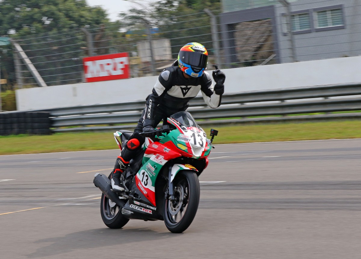 The last race of the Pro-Stock 165cc category saw a 1-2 win for TVS Racing with KY Ahamed and Deepak Ravikumar finishing first and second respectively. Rajiv Sethu of the Idemitsu Honda SK69 Racing team finished the race third. Jagan Kumar who finished the race in fourth place had a sensational ride because he was crowned champion of the class just a day earlier. This was an extremely emotional victory for him because it was his 10th National Championship win as well. TVS Racing had more reason to be elated because apart from Jagan taking top honours, the factory team also won the Team and Manufacturing Championship