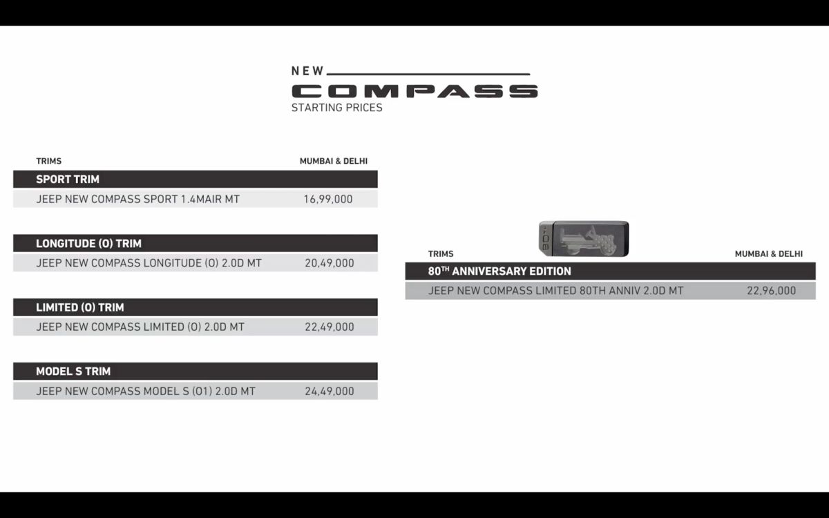 Variant wise pricing for the 2021 Jeep Compass