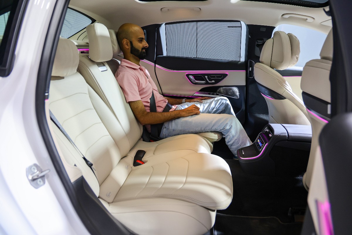 Let’s start from the backseat because this is where most E-Class owners will spend their time. You get a three-seat bench with a chunky armrest that folds down to make this feel like a genuine two-seater at the back. Space is very generous, with respect to both knee room and headroom. The front seat position can also be controlled from the backseat itself, allowing the passenger to free up even more space than there already is.