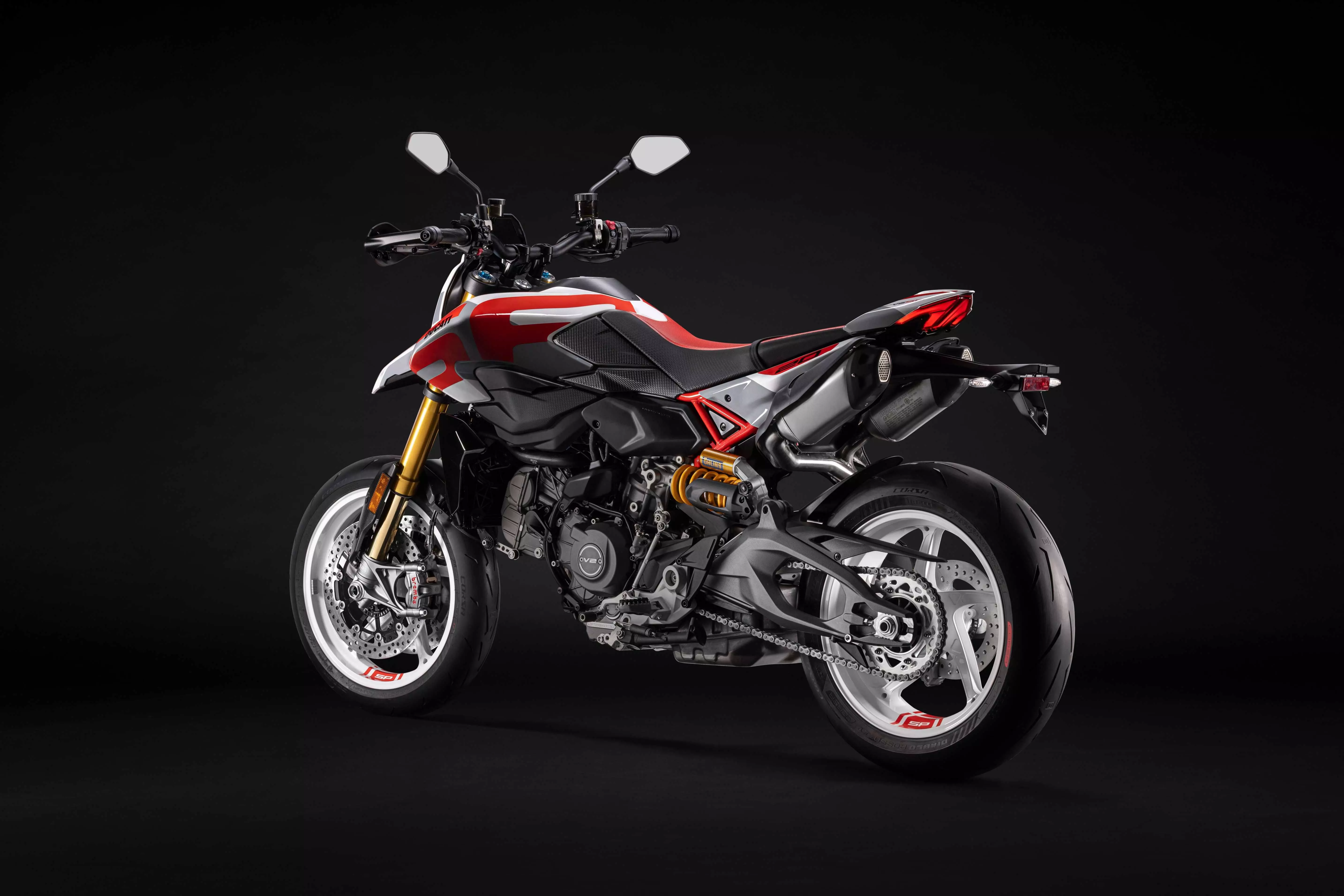 The Hypermotard V2 SP pushes the limits even further. It carries everything that the standard bike gets but apart from that it sports a striking SP livery and track-ready components including fully adjustable 48mm Ohlins NIX 30 USD forks and an Ohlins STX46 monoshock at the rear. The SP swaps to forged aluminium wheels shod with Pirelli Diablo Rosso IV Corsa tyres for extra grip, while braking performance steps up with top-spec Brembo M50 calipers. At just 177kg (kerb, without fuel), the SP sheds an additional 3kg compared to the standard V2, courtesy of a lighter lithium battery and carbon fibre front fender. With its reduced weight, enhanced suspension, and sharper tyres, the Hypermotard V2 SP delivers even more agility and track precision.