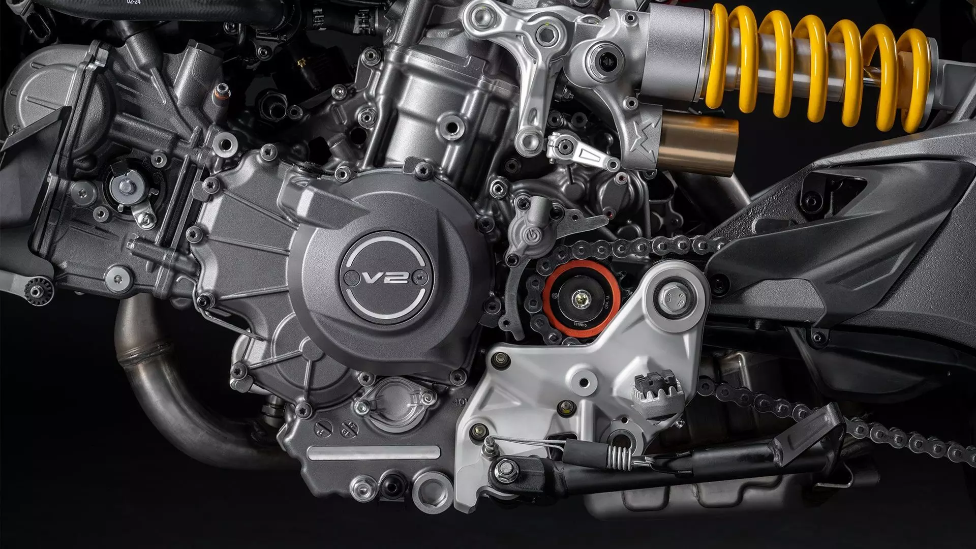 The frame consists of an aluminum monocoque, a steel trellis rear subframe, and a cast aluminum swingarm, borrowing philosophy from the Multistrada V4. The bike features ergonomic enhancements, a lower seat height, and improved passenger comfort with adjustable seat options and revised rear attachments for top box and side cases.