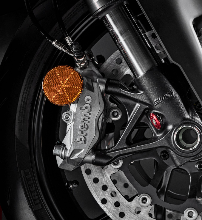 The Brembo monoblock and Showa BPF which encapsulate the front wheel of the V2The new electronics package features three riding modes – Race, Sport and Street. It also includes cornering ABS, traction control, engine braking control and wheelie control, all of which can be operated from the new 4.3-inch TFT display.