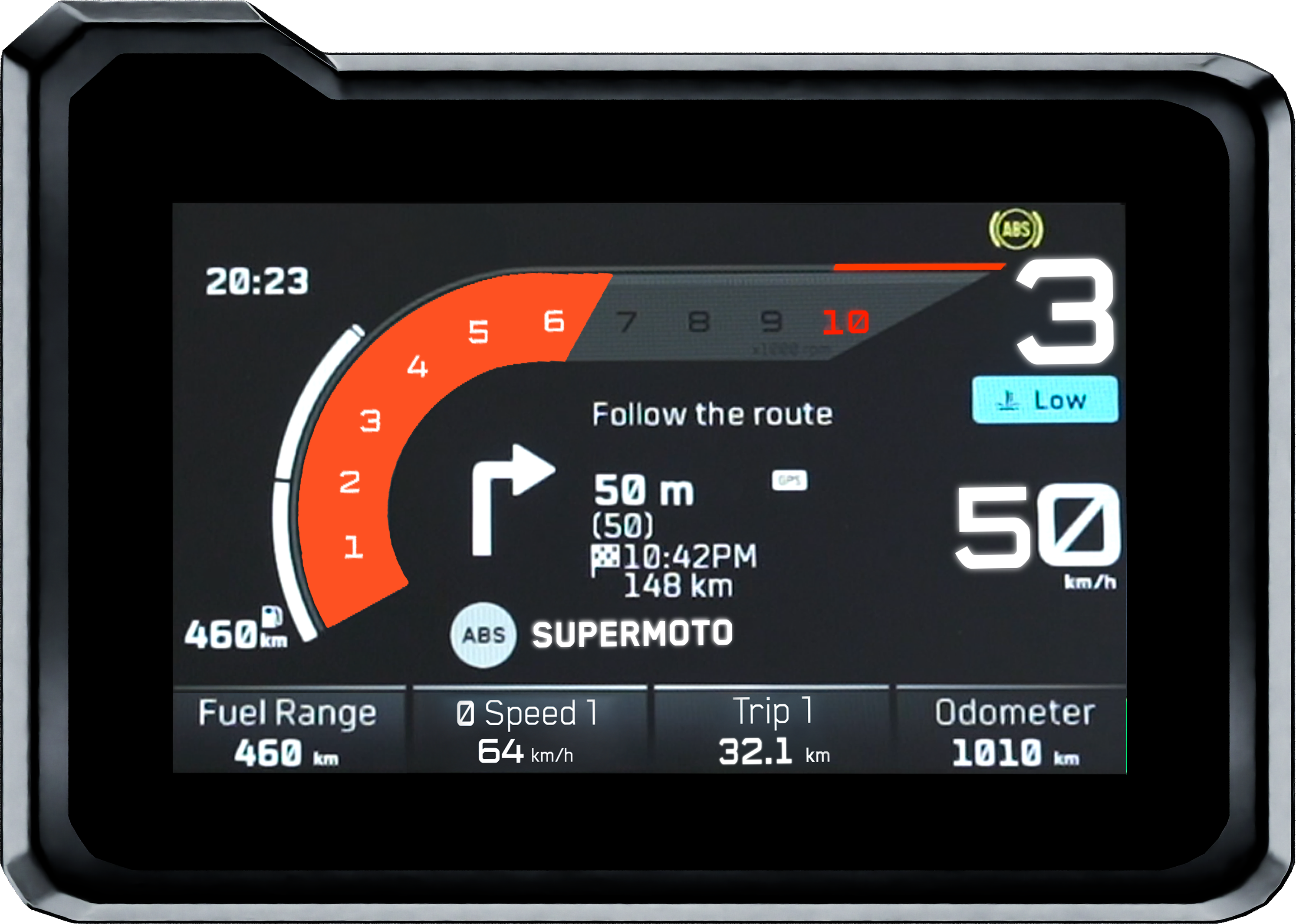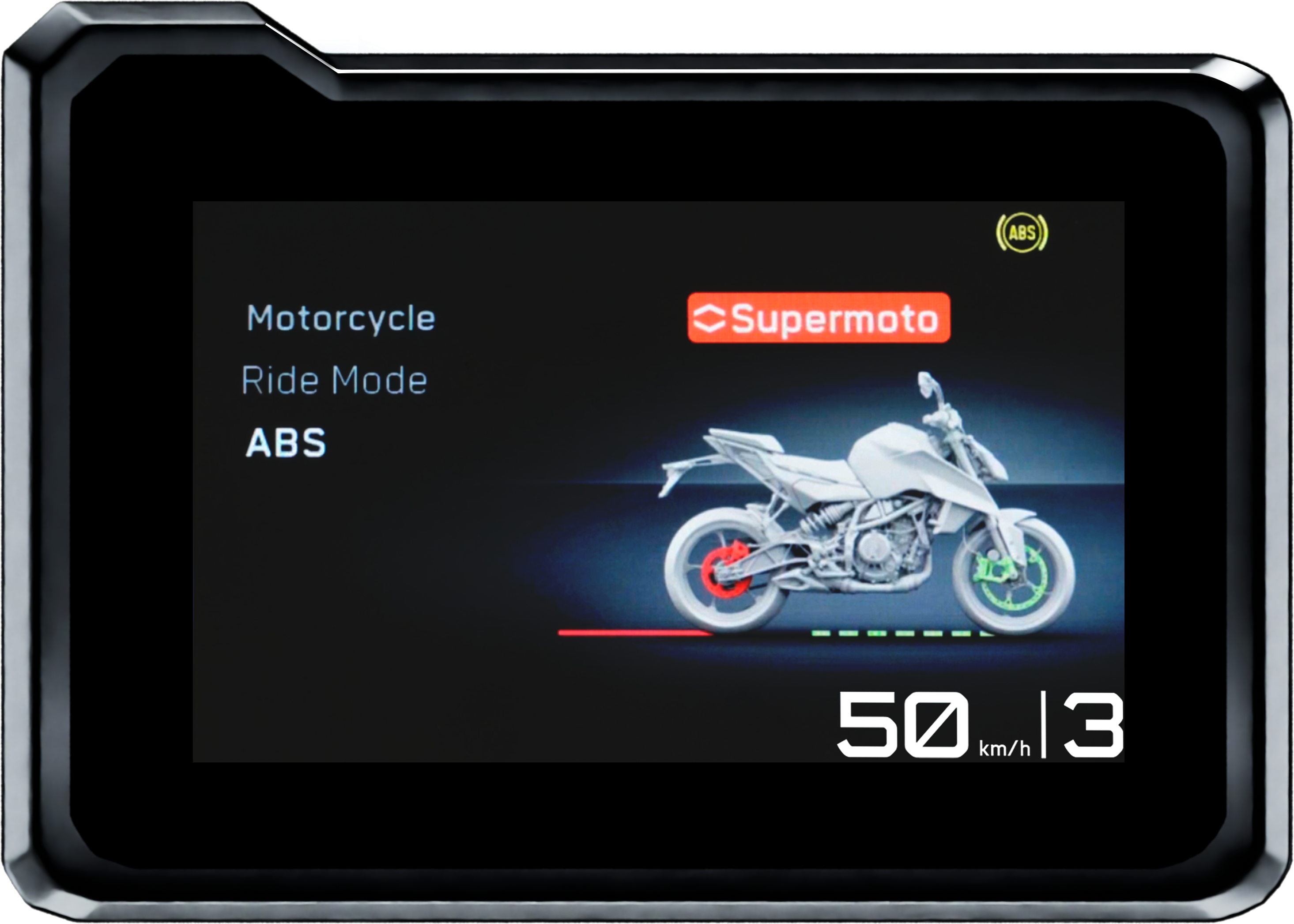 Switchable through the TFT display, Supermoto ABS means disengaging the ABS braking function on the rear end of the bike. This feature is provided for specific purposes, such as controlled slides needed for competition or the demands of Supermoto riding.