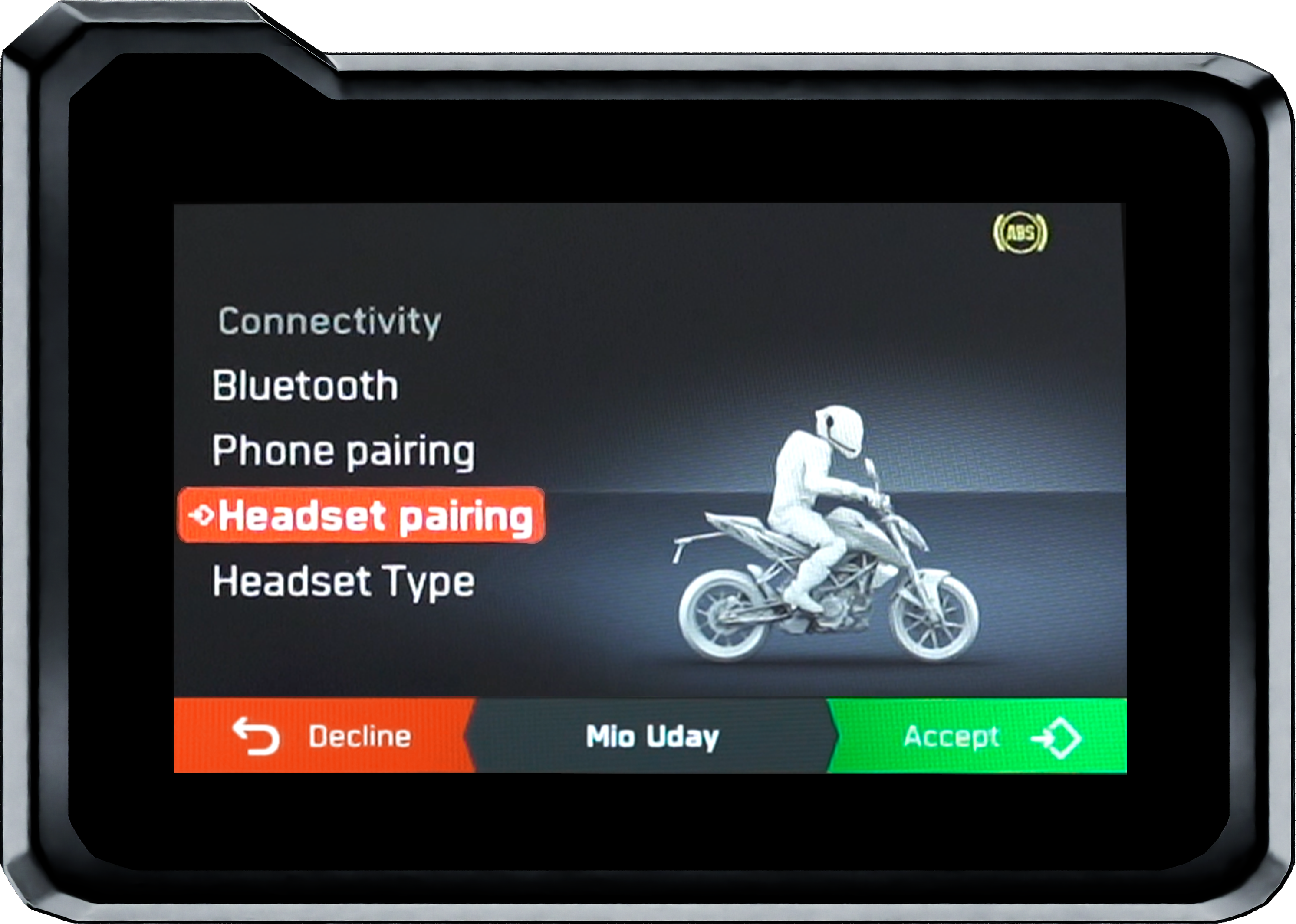 This function allows the rider to see the identification of incoming calls on the TFT display and, using the mode switch, accept or decline the call. As a safety measure, accessing the phone's address book and making outgoing calls is not possible while riding.