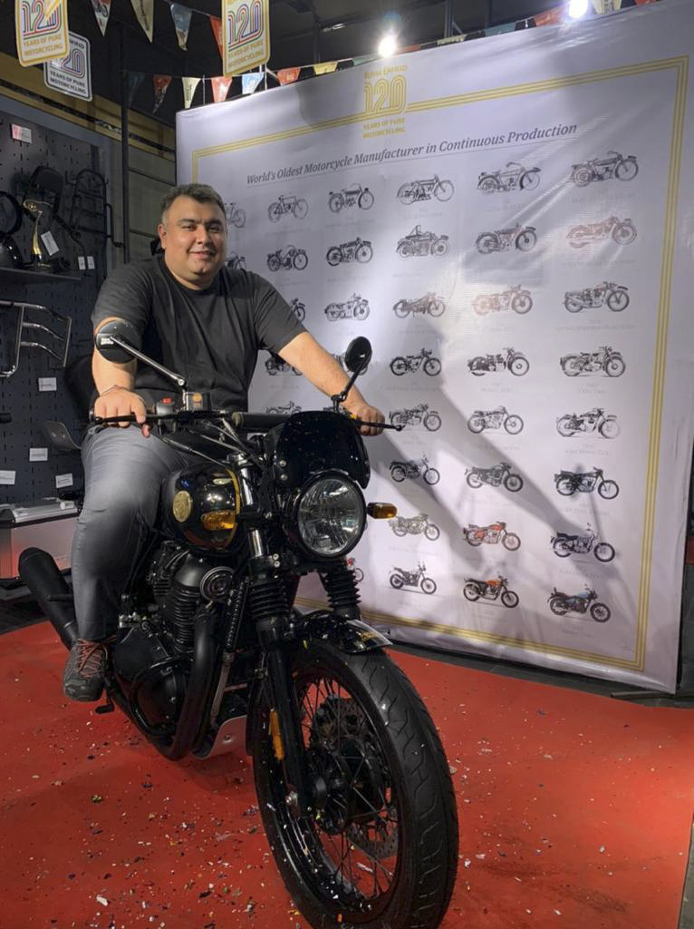 Actor and Director Dhyan Sreenivasan taking delivery of his Royal Enfield Interceptor 650 120th Anniversary EditionThe 120th Anniversary Editions receive a new Black Chrome paint scheme, followed by blacked-out treatment on the engine, silencer, spoke rims, shock absorbers, and other exposed mechanical bits as opposed to chrome offered on their standard counterparts. The GMA accessory pack offered by Royal Enfield will also be offered in a black paint scheme, which includes kit such as the engine guard, flyscreen, bar-end mirrors, and heel guards. Some impressive touches — the top badge on the tank will feature a unique serial number, and the side panels get a new decal paying homage to Royal Enfield’s 120 years. Both motorcycles also feature a new, unique die-cast brass tank badge, along with the trademark Royal Enfield pinstriping usually seen on the Bullet Standard 350 nowadays.