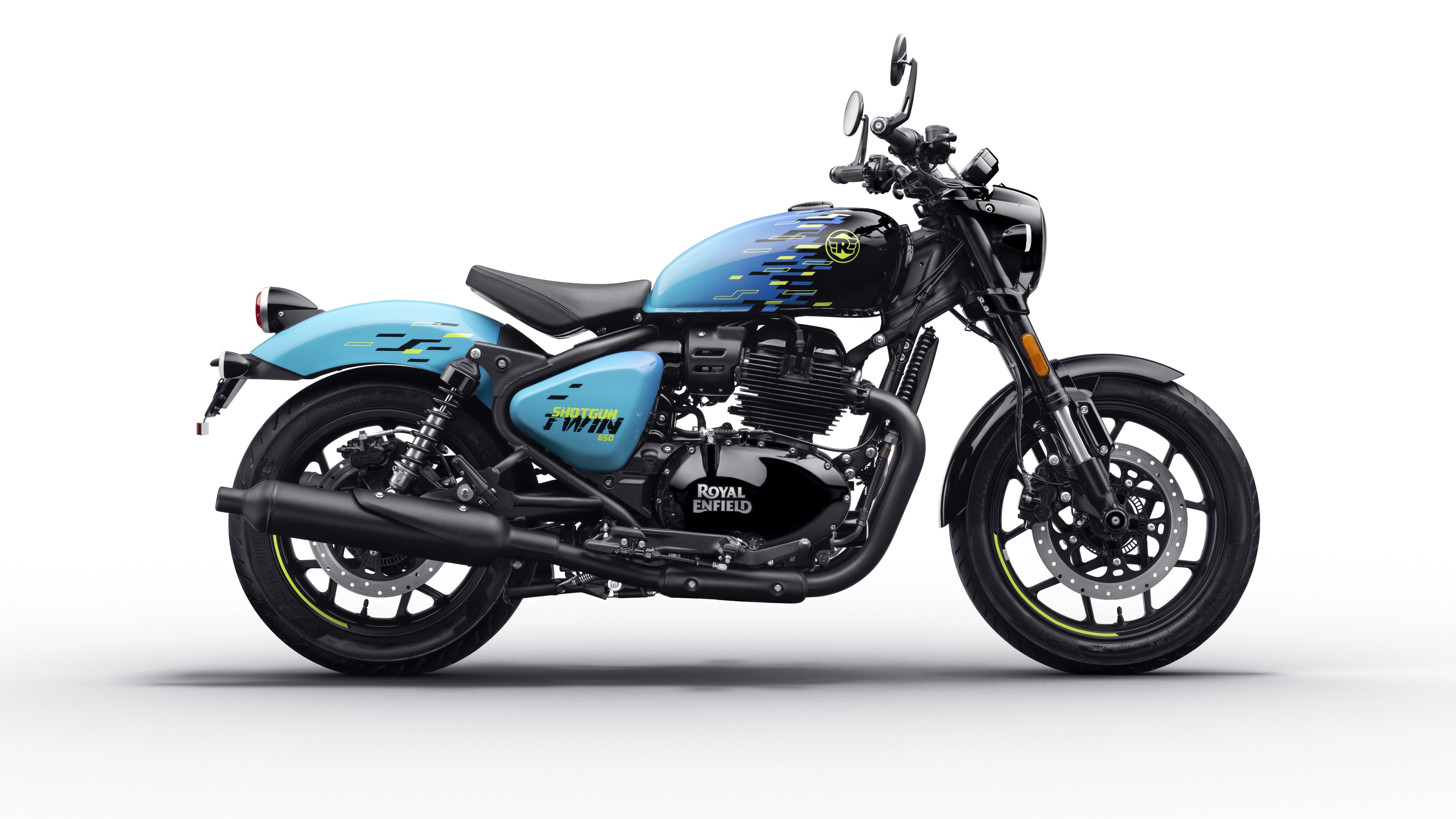 The Shotgun 650 is built on the same platform as the Super Meteor 650. The Shotgun has a steel chassis with a tubular spine frame. It has ten-spoke wheel rims that are ABS-equipped. The front suspension features upside-down forks, while the rear is equipped with twin shocks. The handlebars are low-rise and extra-wide. Royal Enfield Genuine accessories such as bar end mirrors and LED black indicators are included with the bike.