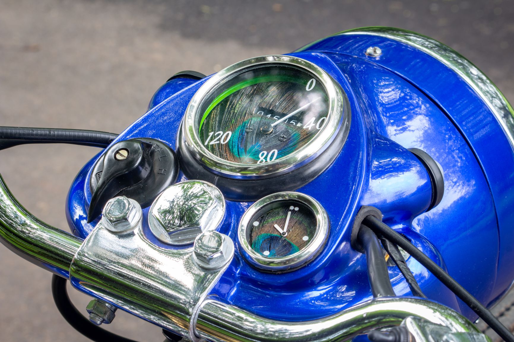 With the bike now in running order and being taken out for test rides, Shashank was pleasantly surprised with the jaw-dropping reactions from the people on the road. He correlated the fact that they seemed both impressed and intrigued with the kind of reaction people give to the sight of a dancing Peacock. To that end, he decided to incorporate a peacock feather in the redesigned speedometer dial as well as in the ampere meter casing, which now held a quartz watch.