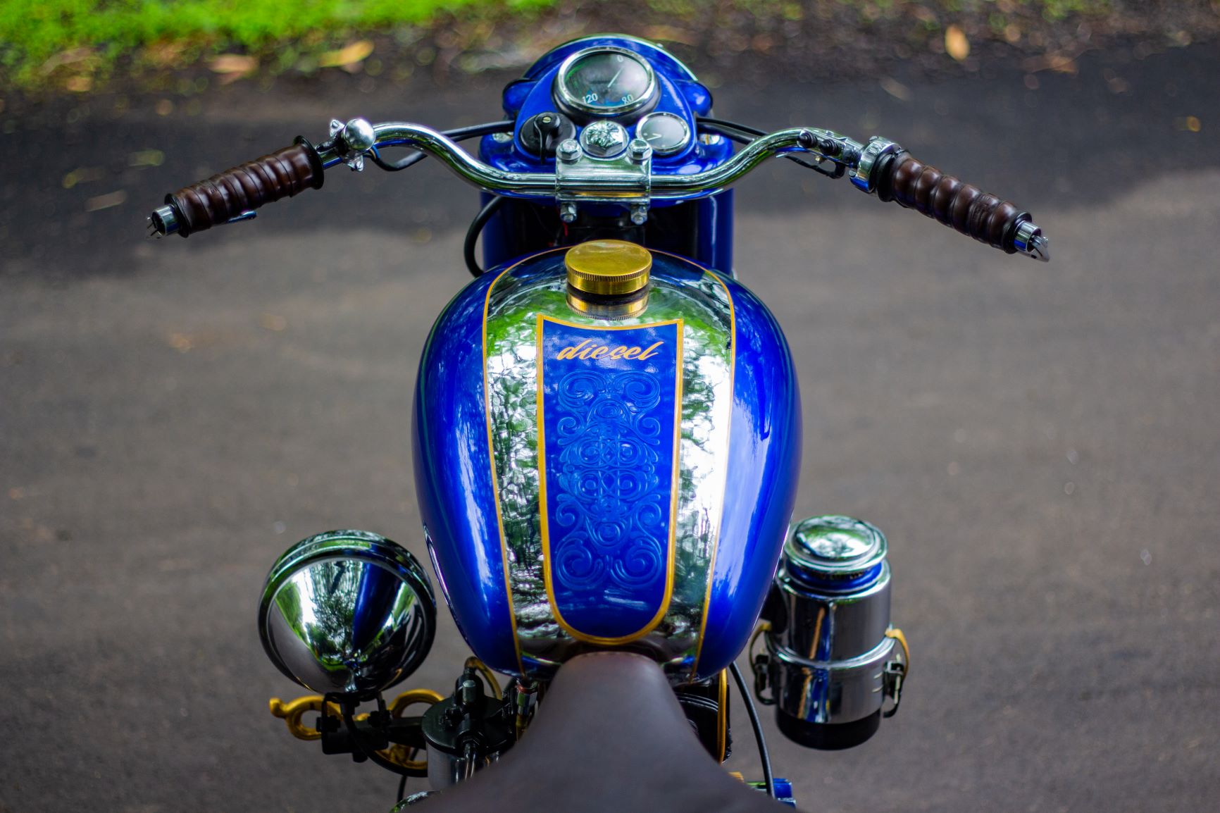 Staying with the Peacock theme, Shashank disassembled the bike and sent most of it to be enveloped in a new Axalta indigo colour, which best represents the Indian Peacock. A few other parts like the front brake cam, part of the flywheel, wheel hubs, fog light mount, air filter and the diesel fuel line were carefully hand-painted in gold. Finally, everything was sent to 3M for paint protection. The finished product was christened ‘Navilu’, the Kannada word for peacock.