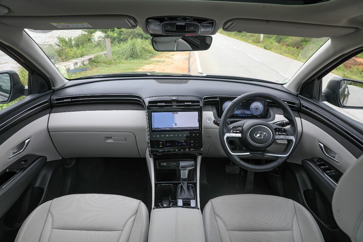 On the inside, the new Hyundai Tucson has been revamped significantly, with the basic layout reminiscent of the Alcazar. You get a dual-tone black and beige colour scheme along with a lot more soft-touch materials as compared to the predecessor’s plastics, and the cabin also gets ambient lighting featuring 64 colour choices. You get a 10.25-inch touchscreen for the infotainment that gets Alexa and Google Home connectivity baked in along with Apple CarPlay and Android Auto. You also get an 8-speaker Bose sound system, three drive modes, and the AWD-equipped variants also get terrain modes. There’s also a 10.25-inch digital instrument cluster on offer which also displays the blind spot view monitor. Both the driver and passenger seats are power adjustable and the Tucson, keeping in line with recent Hyundais packs in a lot of equipment.