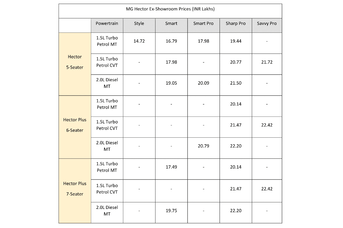 The MG Hector facelift is offered in five variants: the Style, Smart, Smart Pro, Sharp Pro and Savvy Pro. The smartphone sounding variant names are further divided by the number of seats on offer, with five-seats as standard and six and seven-seat options on the Hector Plus. Here’s the price breakdown of all the variants: