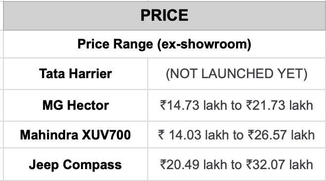 2023 Tata Harrier spec comparison vs rivals