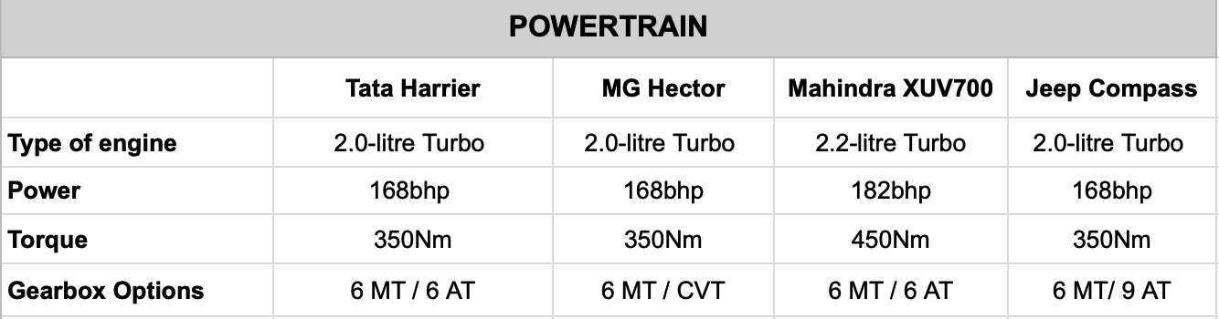 As for its rivals, the MG Hector and the Jeep Compass stay on par with the new Harrier as they feature a 2.0-litre turbocharged diesel engine as well producing almost the same performance figures. However, the Mahindra XUV700 is the most potent amongst these cars. It has a bigger 2.2-litre turbo diesel engine that produces 180bhp and 450Nm, which is 12 bhp more and a 100Nm of torque more than the new Harrier. What is common between the vehicles is that all of them offer a 6-speed manual transmission. Additionally, the Tata Harrier and Mahindra XUV700 both offer a 6-speed automatic transmission, whereas the MG Hector comes with a CVT option and the Jeep Compass comes with a 9-speed automatic transmission.