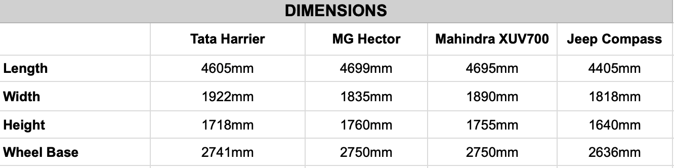 The new Tata Harrier measures approximately 4605mm in length, 1922mm in width, and 1718mm in height, with a wheelbase spanning 2751mm. When compared to its rivals, the MG Hector is the longest and the tallest. The Tata Harrier comes in as the widest car of them all. On the other hand, the Jeep Compass can be seen as the smallest car amongst its competitors since it has the smallest measurements in this group. As for the wheelbase, except the Compass, the other cars measure close to the 2750mm mark with the Harrier only 9mm shorter than the MG Hector and Mahindra XUV700.