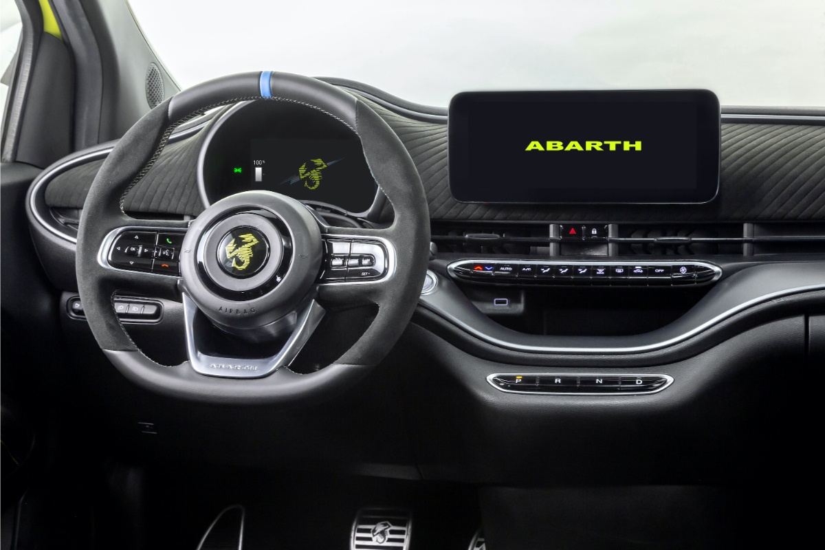 Abarth 500eTo go with the changes to the chassis and powertrain, Abarth has given the 500e its own tougher stance, with new design elements inside and out. These include new bumpers, the front end being deeper and more aggressive, with colour-coded grille openings and Abarth script between the LED headlights. At the rear, Abarth has fitted a tiny diffuser like insert right at the base of the rear bumper with a matching roof spoiler. There’s also a new set of 18-inch wheels and some fresh paint options, headlined by the acid yellow launch colour. Inside, the 500e’s interior is largely unchanged, with the main changes reserved to new Alcantara trim on the dash, seats and the new three-spoke steering wheel.