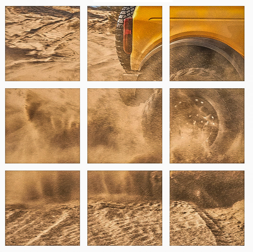 Fittingly a 'bucking' Bronco, to flatten those terrains The bottom collage of nine images show off what looks like the Desert Mountain range in the background, with the sandy terrain of the foreground progressing into muddy tracks, with the bucking Bronco emblem at the tracks’ vanishing point.