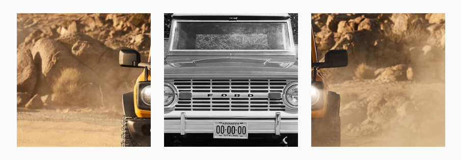 Churning up the earth, just like the old days...Right below it is a three-image composition comprising a dimly-lit silhouette of the Bronco’s front, showing off the grille and headlights. The middle image, is a video, but we’ll get to that in a bit. The next row of images show off the fenders, headlights and ORVMs of the 2020 Bronco, juxtaposed with the middle image which shows off the grille, headlights and windscreen of the original.
