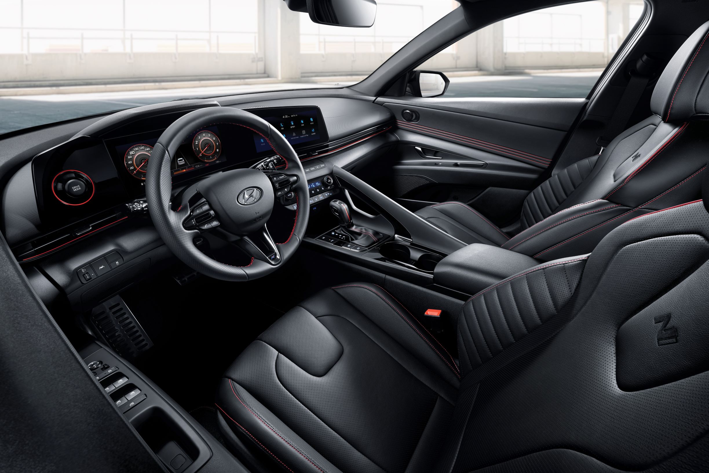 Leather bucket seats, as is the industry standard for performance sedans.The design team has worked toward a sporty yet sophisticated look for the Elantra N Line to go with its sporty character. This is achieved with sporty side skirts, an integrated spoiler, twin chrome exhausts and a N Line specific rear diffuser.