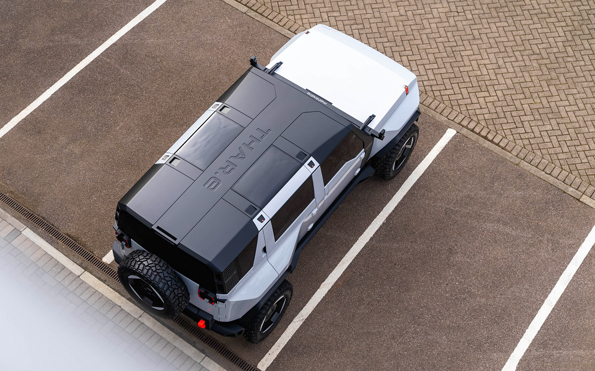 Thar.e branding on the roof that has integrated slots for a roof rack