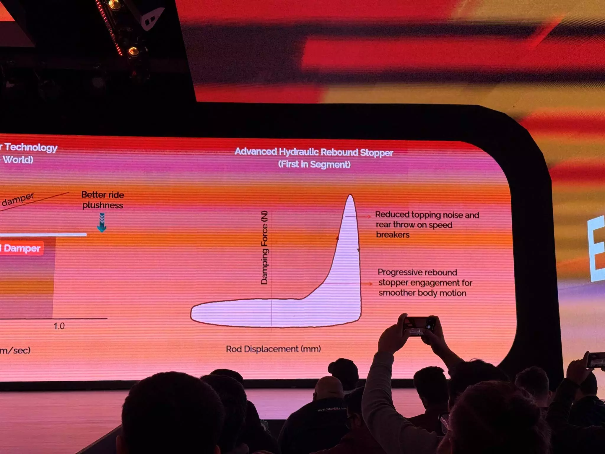 Where do you see this in action? Imagine driving down the highway and seeing an unmarked speed breaker at the last second — an all-too common phenomenon in India. You slam the brakes and the nose dives down as you approach the bump. You’ve not slowed down enough and slam into the speed breaker. The speed breaker forces your suspension to compress. As you roll off the speed breaker, the compressed spring is storing incredible amounts of energy and pushes the wheel away from the body with massive force. If the force is enough, it would cause the damper to reach the end of its travel at full extension. This is called topping out. At this point, with a conventional rebound stop, the suspension would be unable to extend any more and you can hear and feel a clunk, while the rear can unload too fast and rear passengers feel like they’re being tossed upwards.