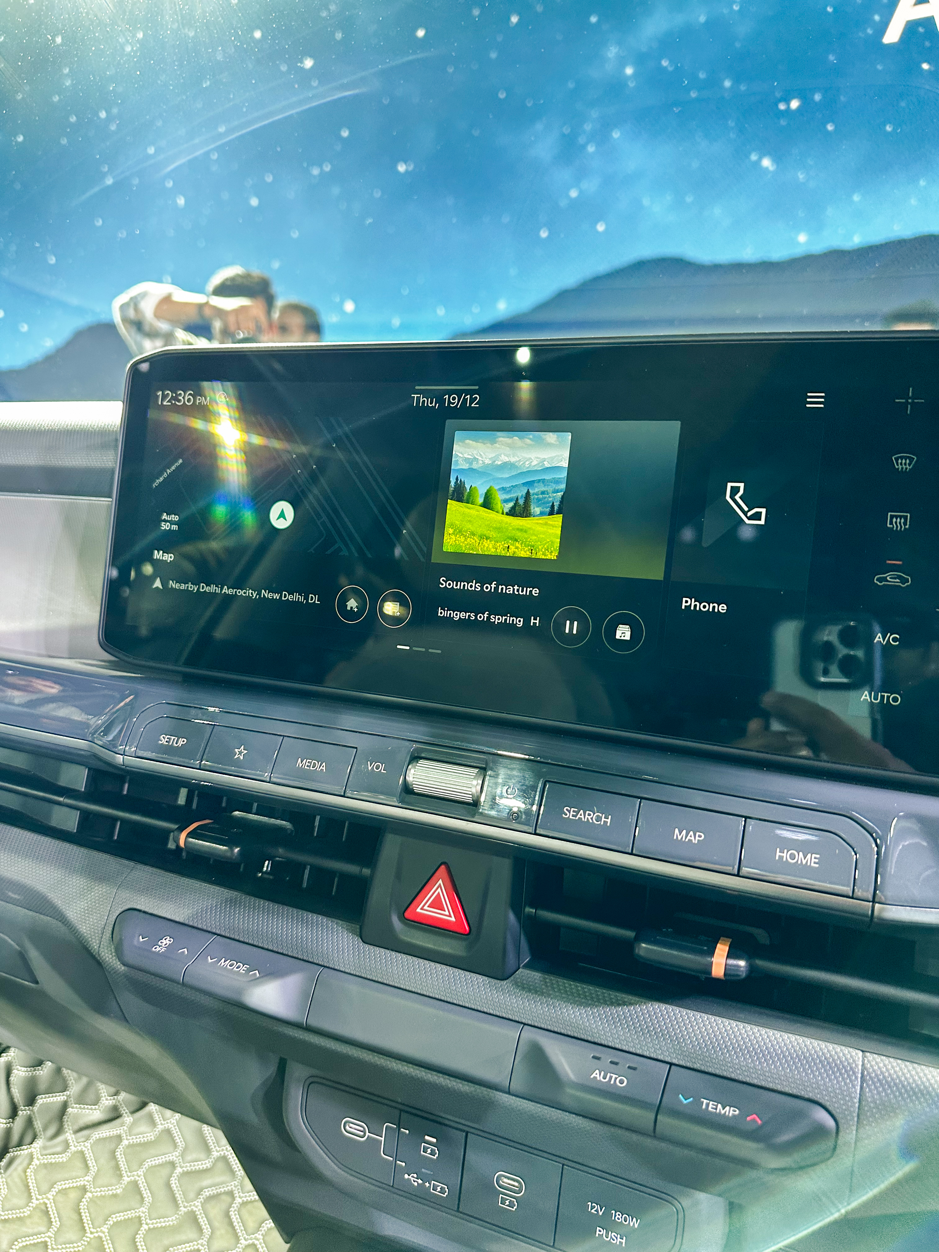 On the inside, you get an all-new dashboard and a two-spoke steering that reminds you of the one in the much more expensive Kia EV6, and the Syros also gets 64 colour ambient lighting throughout the cabin. You get a 30-inch slab of digital real estate – comprising two screens for the digital instrument cluster and the infotainment screen, with physical switches below the screen.