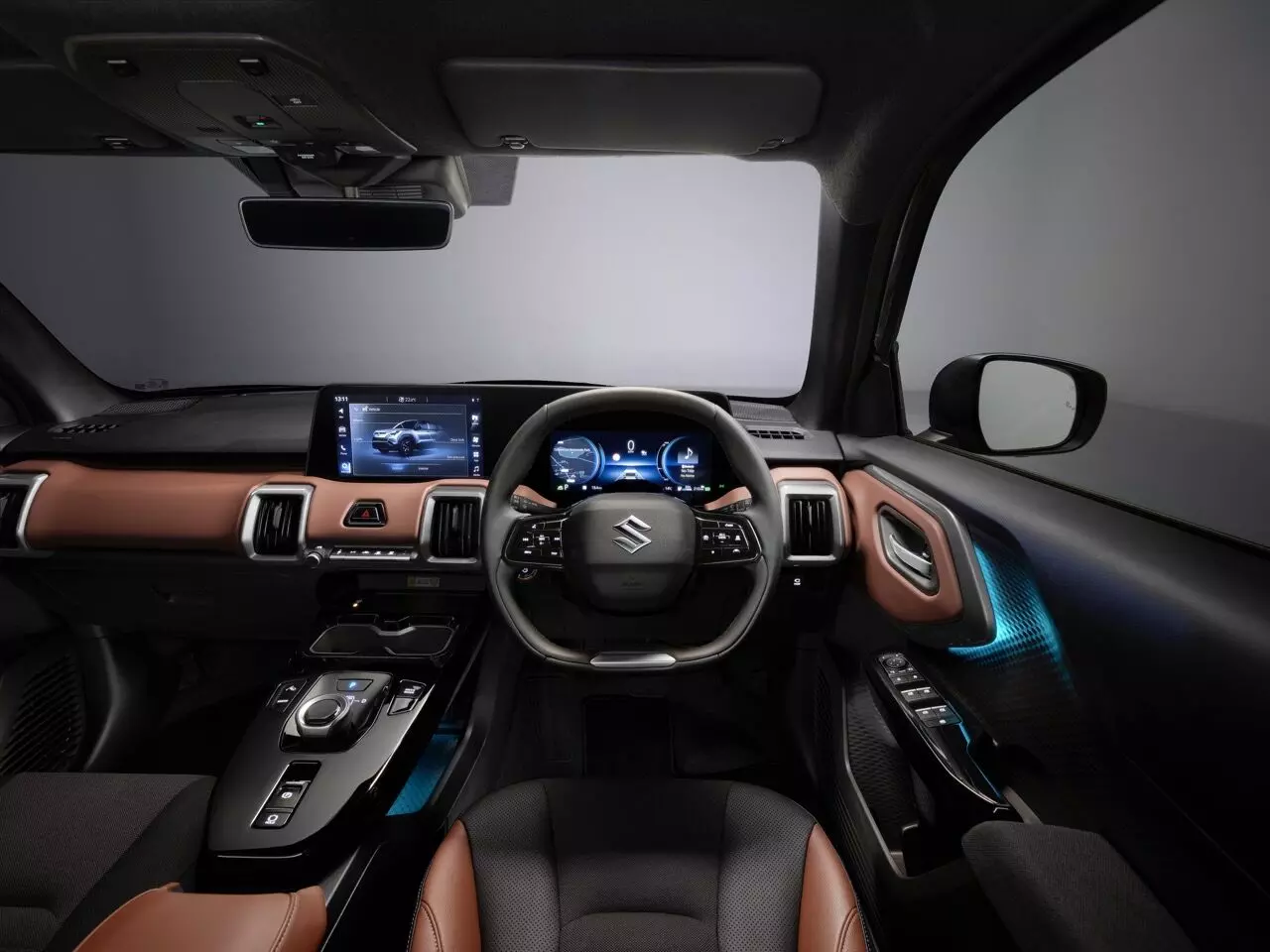 The e Vitara is unlike anything we’ve seen from the brand in India, but it does bear a passing resemblance to the Grand Vitara with its mid-size SUV proportions and strong chin upfront. It doesn’t get a conventional grille because it’s an EV, but what you get instead is an active lower grille for cooling. The headlamps and tail lamps get what Maruti calls a ‘three-point’ motif, and the SUV rides on 18-inch alloy wheels with aero covers. The e Vitara will have five main exterior paint schemes to choose from — Splendid Silver, Arctic White, Grandeur Grey, Bluish Black, Opulent Red, Land Breeze Green and Nexa Blue along with four dual-tone options.
