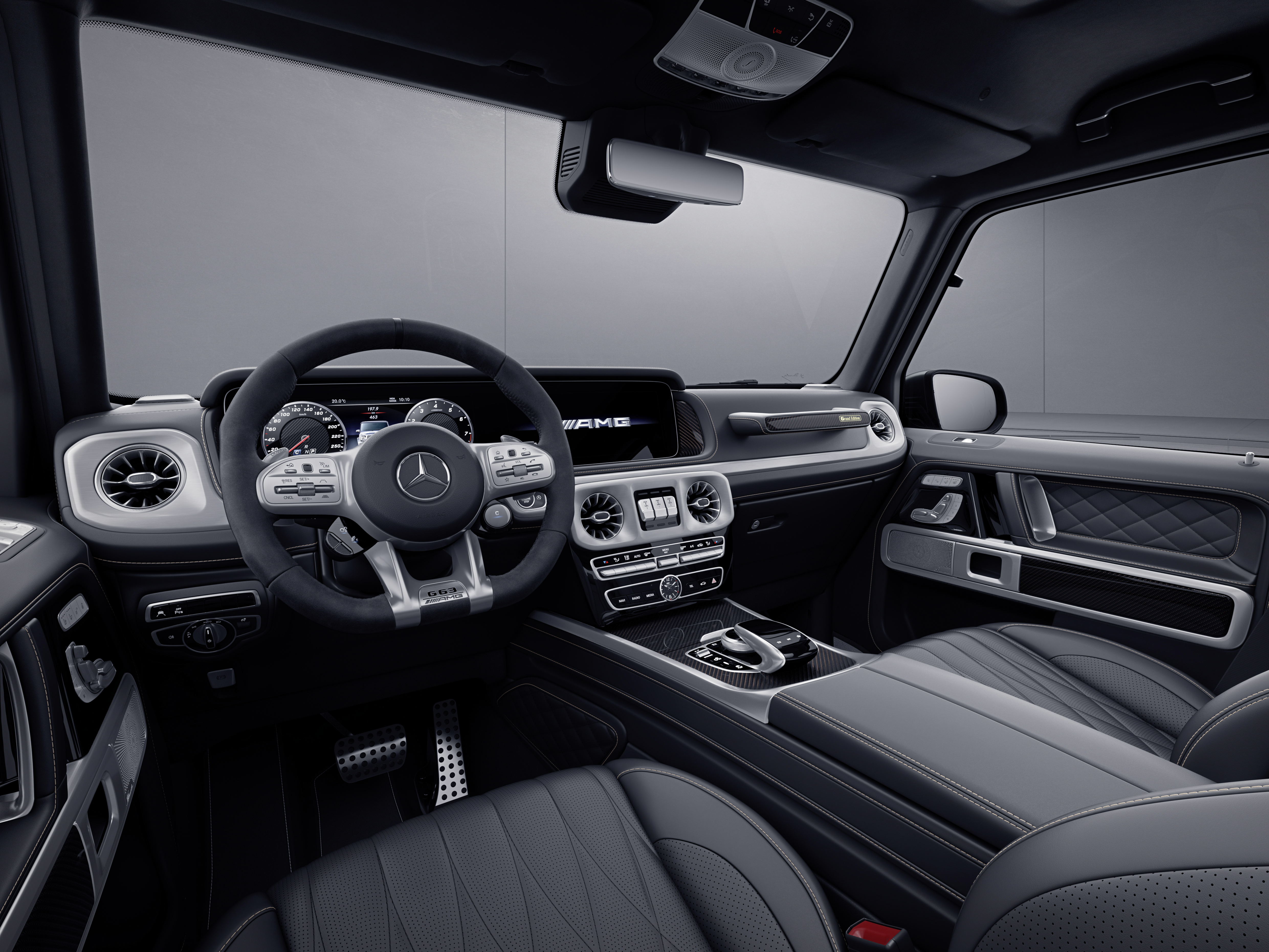 The interior of the AMG G 63 ‘Grand Edition’ also showcases the same black and gold elements found on the exterior of the car. Inside the vehicle, you'll notice illuminated "AMG" emblems on the black door sill trims. The seats are upholstered in G Manufaktur black nappa leather with a gold stitching and backrests that feature plaques with a gold AMG logo and gold borders. Even the floor mats follow the black and gold theme with a decorative gold stitching. Nappa leather is also used for the roof grab handles, and the passenger-side handle's inlay boasts carbon with copper thread, along with a "Grand Edition" badge. Other interior trim components are finished in carbon with copper thread and the AMG Performance steering wheel is wrapped in Dinamica microfiber, including a distinctive G 63 plaque on the steering wheel clasp.